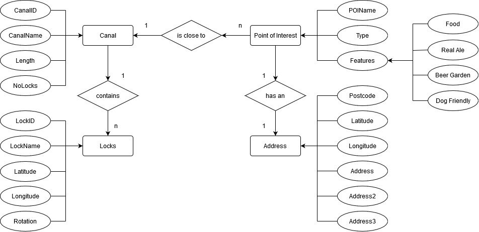 The ER diagram above shows how the data are related. Should the webmap progress to a PHP based interface, the database will work on a similar premise to that shown.