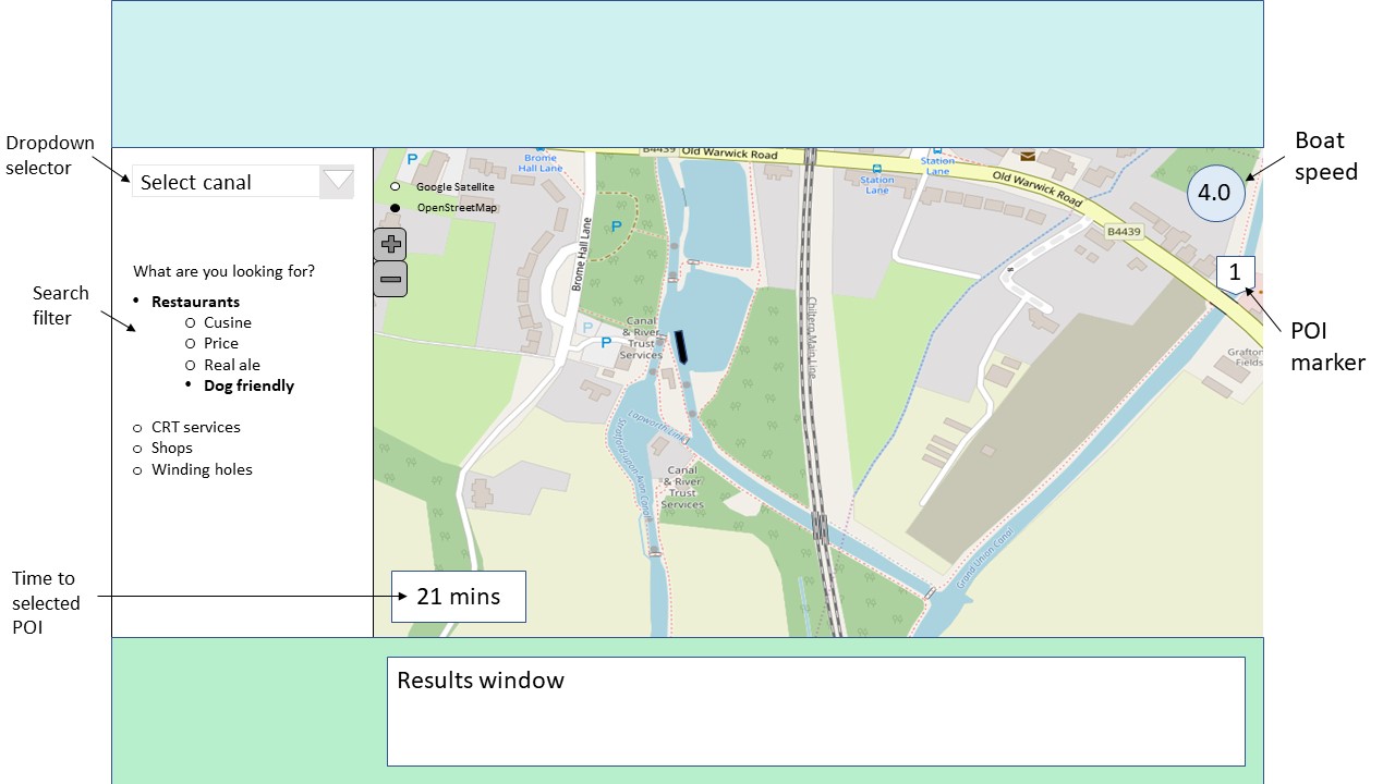 The submitted interface differs from the wireframe shown above in that there is no calculation of cruising time to the POI and that the point markers do not display the number that the POI occurs in the results table. The sidebar navigation also only shows restaurants, rather than CRT facilities and shops.